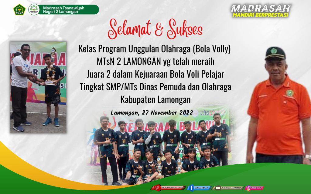 Lamongan, 27 November 2022 tepat di hari Minggu MTsN 2 Lamongan kembali mendapat prestasi non akademik di ajang kejuaraan voli yang di selenggarakan oleh Dinas Pemuda dan Olahraga (Dispora) Kabupaten Lamongan.