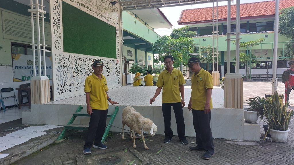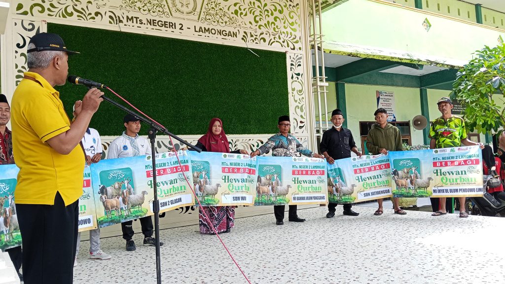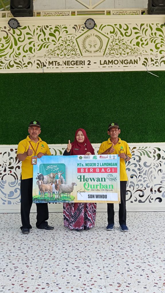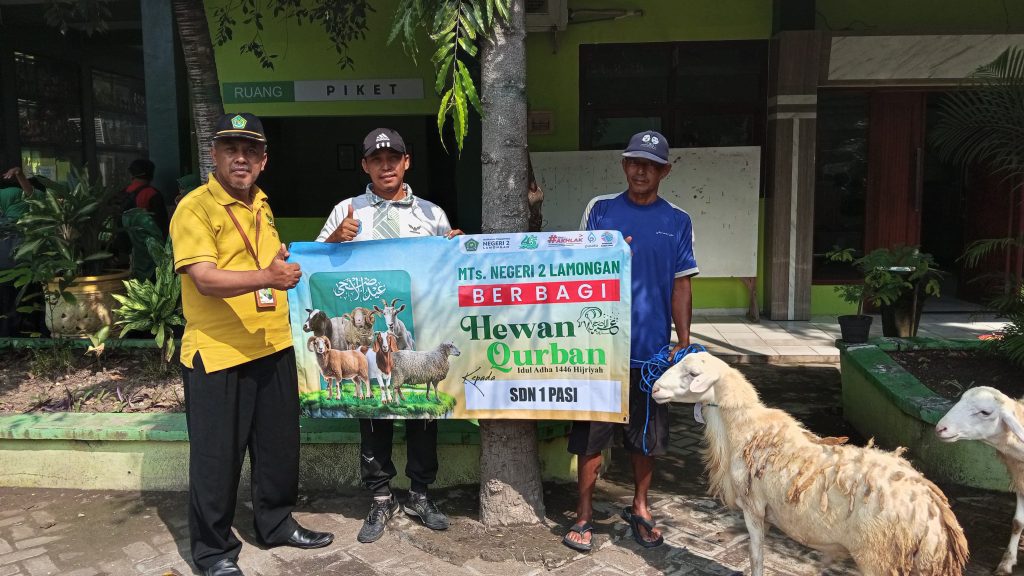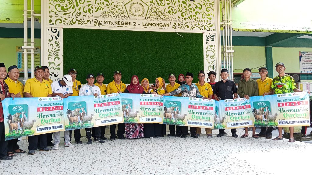 Lamongan, Jawa Timur – Madrasah Tsanawiyah Negeri (MTsN) 2 Lamongan kembali menunjukkan kepedulian sosialnya dengan menyerahkan sejumlah hewan qurban kepada tujuh sekolah/madrasah mitra pada Kamis, 5 Juni 2025.