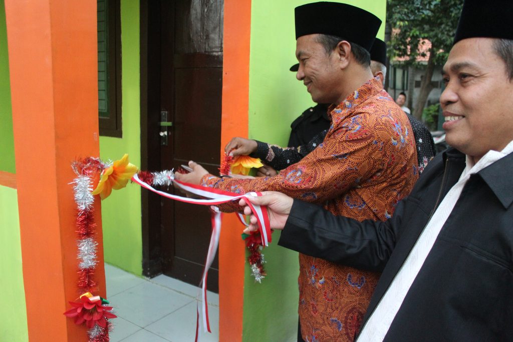Pemotongan pita sebagai simbol peresmian pos satpam dan launching mobil madrasah dilakukan oleh Bapak H. Fausi dilanjutkan penandatanganan prasasti.