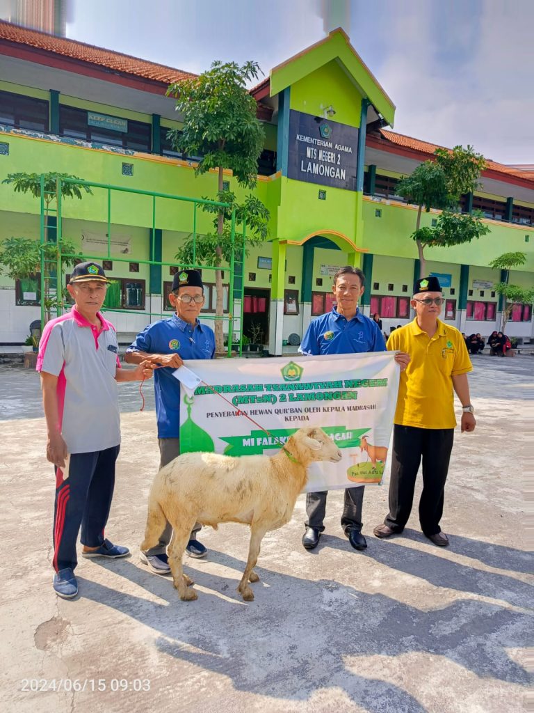Pada tanggal 15 Juni 2024 ini, tim panitia Idul Adha dari MTsN 2 Lamongan mengundang SD dan MI yang telah di sebutkan diatas ke madrasah. Hewan kurban yang masih hidup diserahkan secara simbolis kepada masing-masing kepala madrasah/sekolah. Penyerahan ini dihadiri oleh para pimpinan dari madrasah/sekolah tersebut.