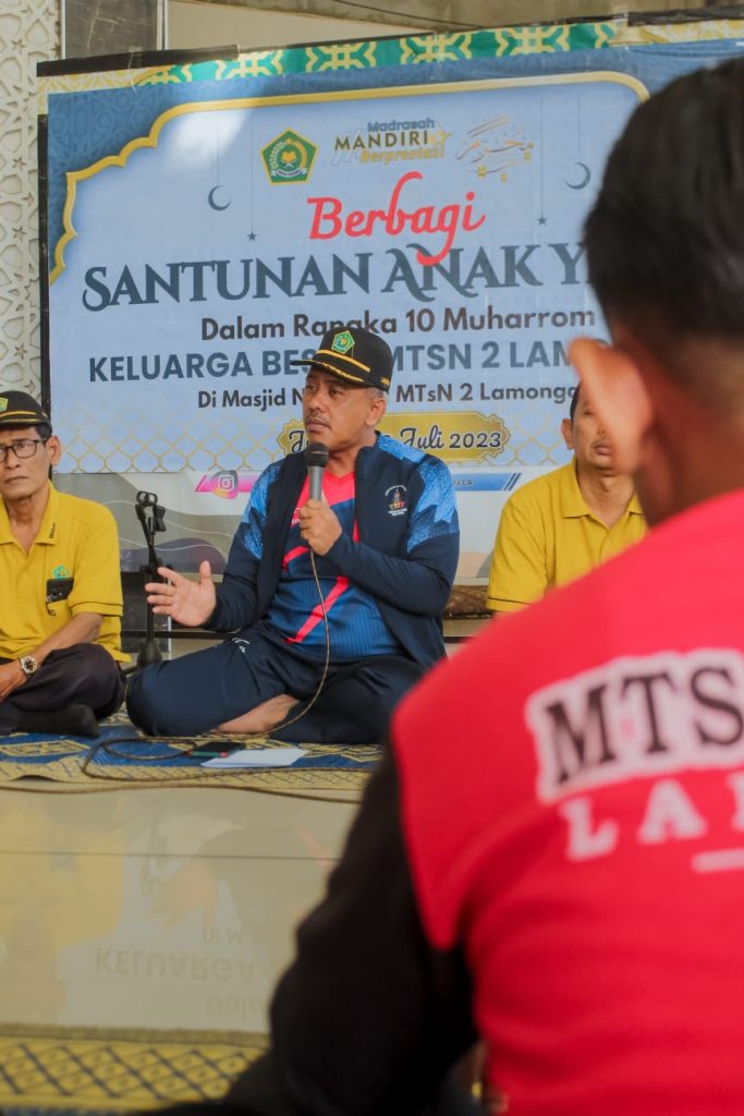 Kepala MTsN 2 LAMONGAN Asman, SAg MPd mengatakan bahwa Kegiatan ini kita Laksanakan sebagai Bentuk Kepedulian kita terhadap Anak Yatim yg harus menjadi Tangung jawab kita Bersama Bahwa mereka juga harus Bahagia dan sukses Dunia Akhirat. Kegiatan ini adalah Rangkaian Kegiatan Panitia PHBI TAHUN BARU HIJRIYAH yg diawali dg Pawai diakhiri dg SANTUNAN pagi ini.