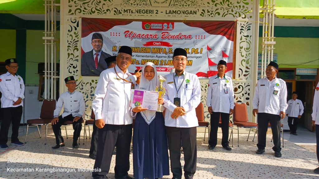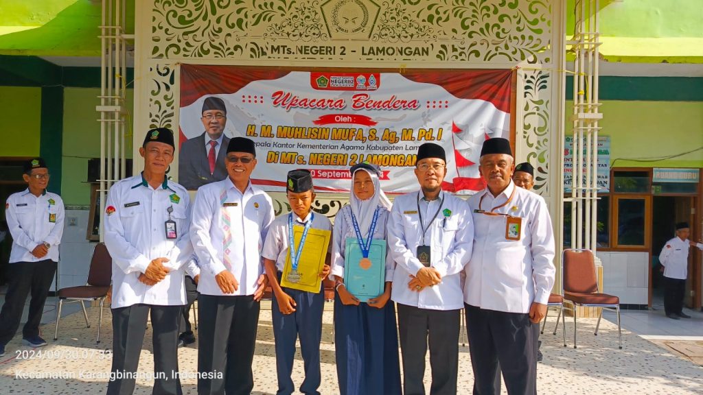 Lamongan- Usai sebagai pembina upacara di halaman MTs Negeri 2 Lamongan (30/9/2024). Bapak H. M. Muhlisin Mufa, S.Ag,.M.Pd.I memberikan apresiasi 3 (tiga) siswa MTs Negeri 2 Lamongan yang berprestasi yakni :
