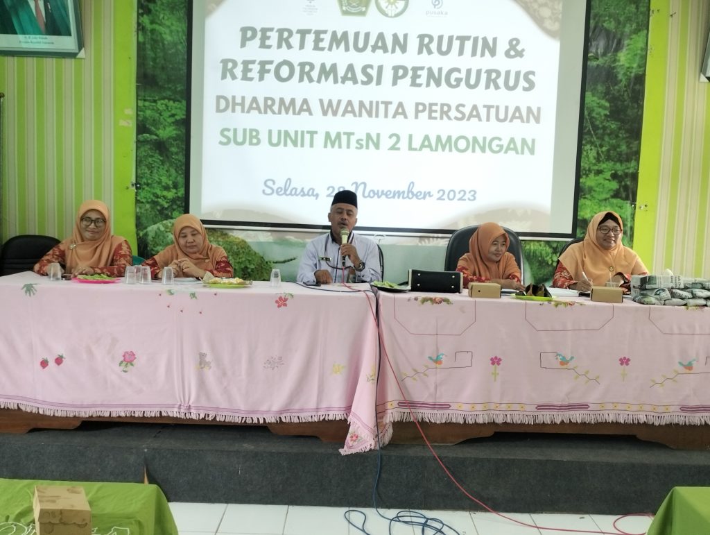 Bapak Kepala Madrasah dalam sambutannya menyampaikan bahwa MTsN 2 Lamongan bercita cita supaya Kedepan semakin baik dengan keaktifan kegiatan kegiatan Dharma wanita. “Saya berharap kekompakan dan keaktifan tim Dharma wanita MTsN 2 Lamongan akan membawa MTsN 2 Lamongan menjadi semakin jaya” Tegas Bapak Asman.