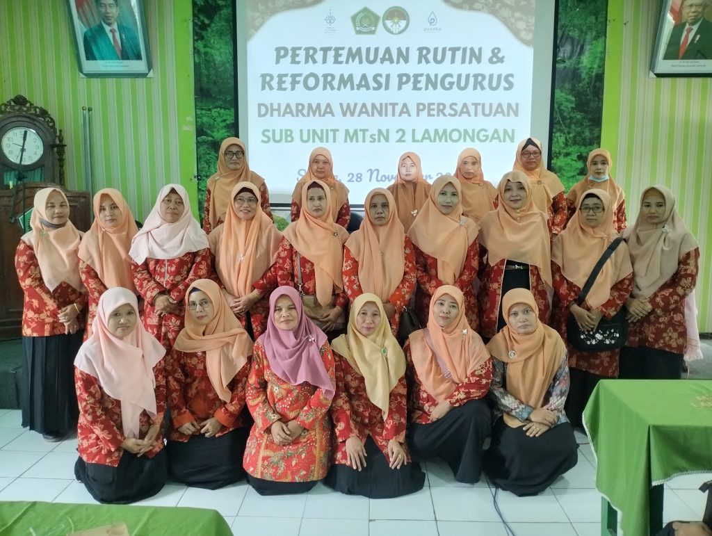 Suasana berbeda tampak di Aula MTsN 2 Lamongan pada Hari Selasa (28/11/2023). Para Ibu yang tergabung dalam Keluarga Besar MTsN 2 Lamongan mengenakan pakaian Batik Dharma Wanita menggelar pertemuan rutin.