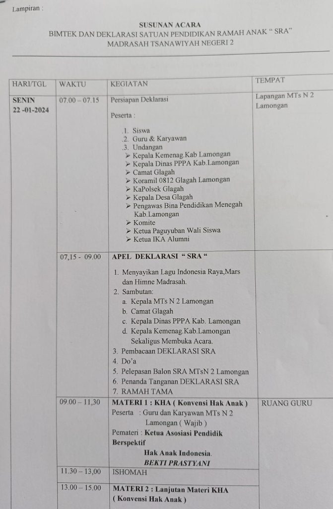MTsN 2 Lamongan menggelar Deklarasi Madrasah Ramah Anak pada Senin, 22 Januari 2024. Kegiatan ini merupakan penguat telah dilaksanakannya pendidikan yang ramah anak di MTsN 2 Lamongan.