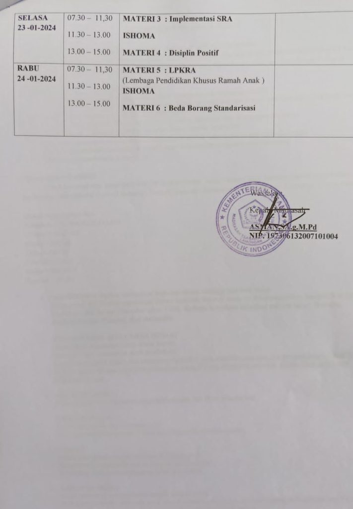 Setelah selesai acara deklarasi dilanjutkan dengan bimbingan teknis (Bimtek) selama tiga hari dari tanggal 22-24 Januari 2025 tentang Madrasah Ramah Anak dengan pemateri ibu Bekti Prastyani selaku Ketua Asosiasi Pendidik Berperspektif Hak Anak Indonesia. Adapun jadwal kegiatan bimtek adalah sebagai berikut :