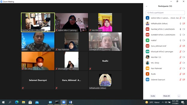 Lamongan, 7/7/2021. Menjelang pelaksanaan masuk tahun pelajaran baru MTsN 2 Lamongan gelar rapat melalui Zoom.  Kegiatan ini dihadiri Kepala Madrasah MTsN 2 Lamongan (Nur Endah Mahmudah), Kepala Tata Usaha (Miftakhuddin), Wakamad dan Panitia MPLM.