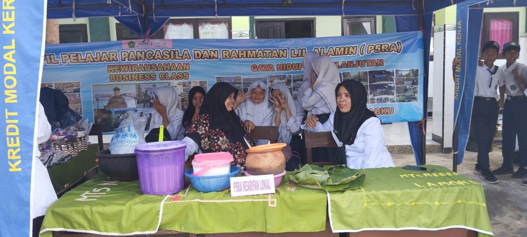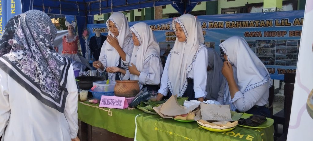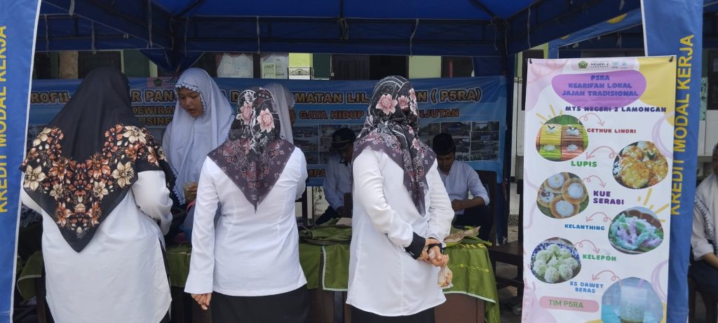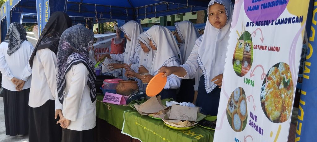 Ainul Rofik, S.Pd selaku koordnator P5RA MTs Negeri 2 Lamongan, menyampaikan disamping hadir dalam bidang seni juga hadir dalam bidang kearifan lokal berupa jajanan dan minuman khas dalam bentuk gethuk lindri, lupis, kue serabi, kelanting, kelepon dan es dawet beras.