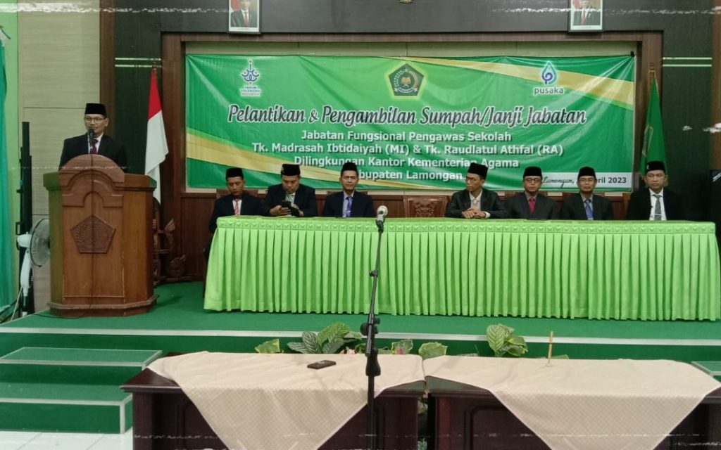 Bertempat di aula lt. 2 melaksanakan kegiatan Pelantikan dan Pengambilan Sumpah Jabatan Fungsional Pengawas Sekolah Tk. Madrasah Ibtidaiyah (MI) dan Tk. Raudlatul Athfal (RA) Dilingkungan Kantor Kementerian Agama Kabupaten Lamongan, Selasa (18/4/2023). Hadir pada acara tersebut Kasubag TU, Kasi, Penzawa, Kepala KUA se Kab Lamongan, Pengawas Madrasah dan Pengawas PAI serta Kepala Madrasah Negeri se Kab. Lamongan.
