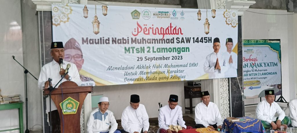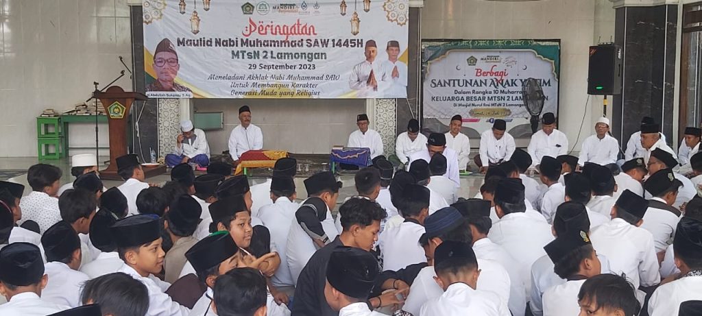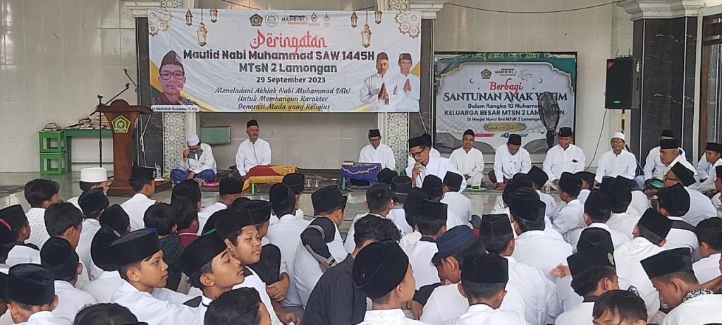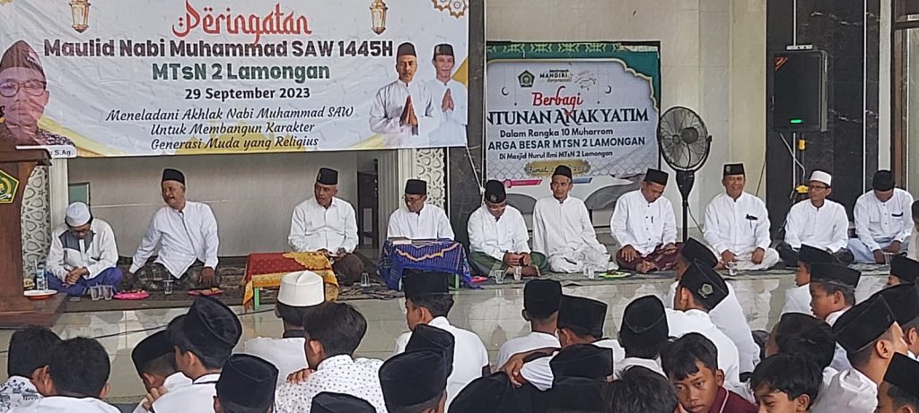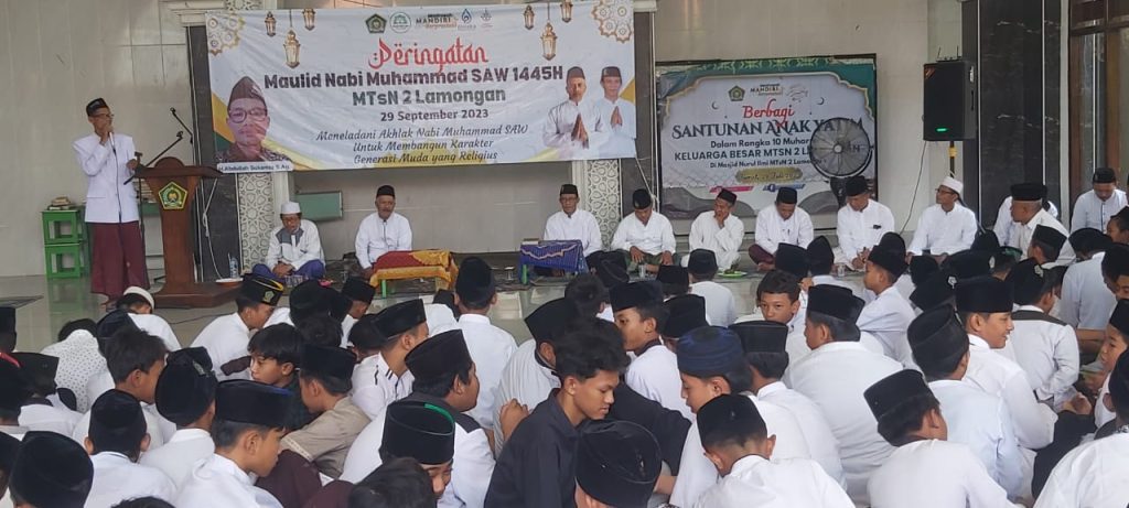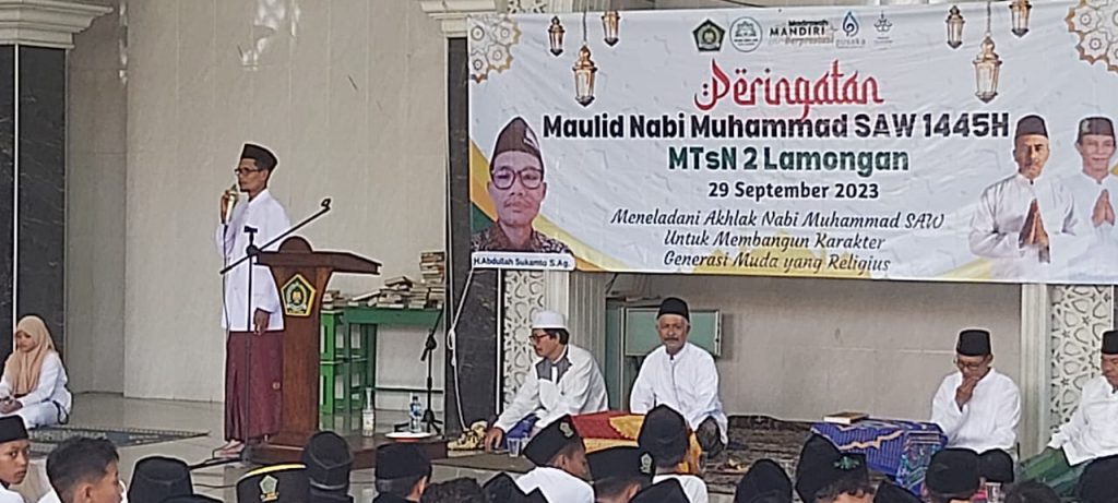MTsN 2 Lamongan menggelar peringatan Maulid Nabi Muhammad SAW di Masjid Nurul Ilmi, Jumat, 29 September pukul 07.00 s.d. 11.00 WIB. Prosesi kegiatan diawali dengan khotmil Qur’an yang di koordinir Pengurus OSIS MTsN 2 Lamongan. Setelah kegiatan tersebut anak anak di Giring ke masjid untuk prosesi acara inti yang dibuka dengan lantunan bacaan shalawat dipimpin oleh ananda Wisnu Muzaki dan diikuti oleh siswa serta guru dan karyawan MTsN 2 Lamongan. Tidak hanya diawali dengan bacaan shalawat, akan tetapi ada pembacaan ayat suci Al-Quran dari siswa MTsN 2 Lamongan.