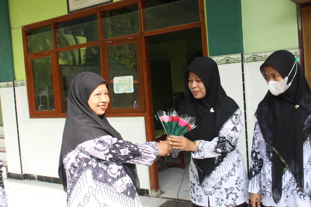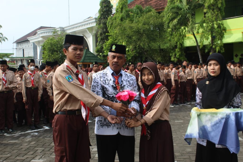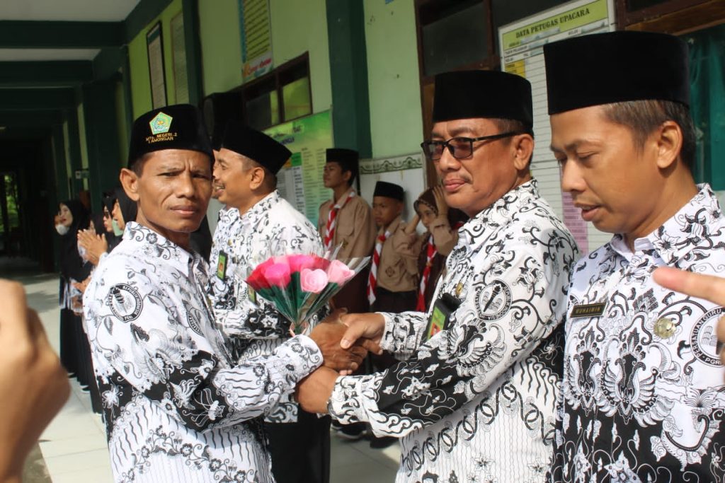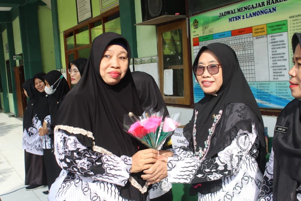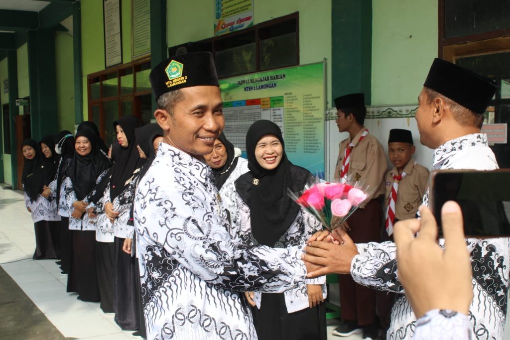 Setelah selesai upacara Bapak kepala Madrasah di beri rangkaian bunga oleh anak anak sebagai perwakilan adalah ketua OSIS dan ketua MPK MTsN 2 Lamongan. Dilanjutkan dengan Bapak/Ibu guru saling bertukar bunga dan mengucapkan terima kasih.