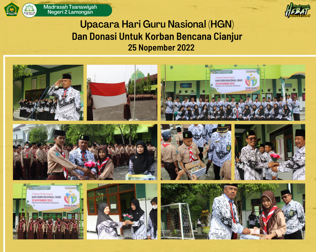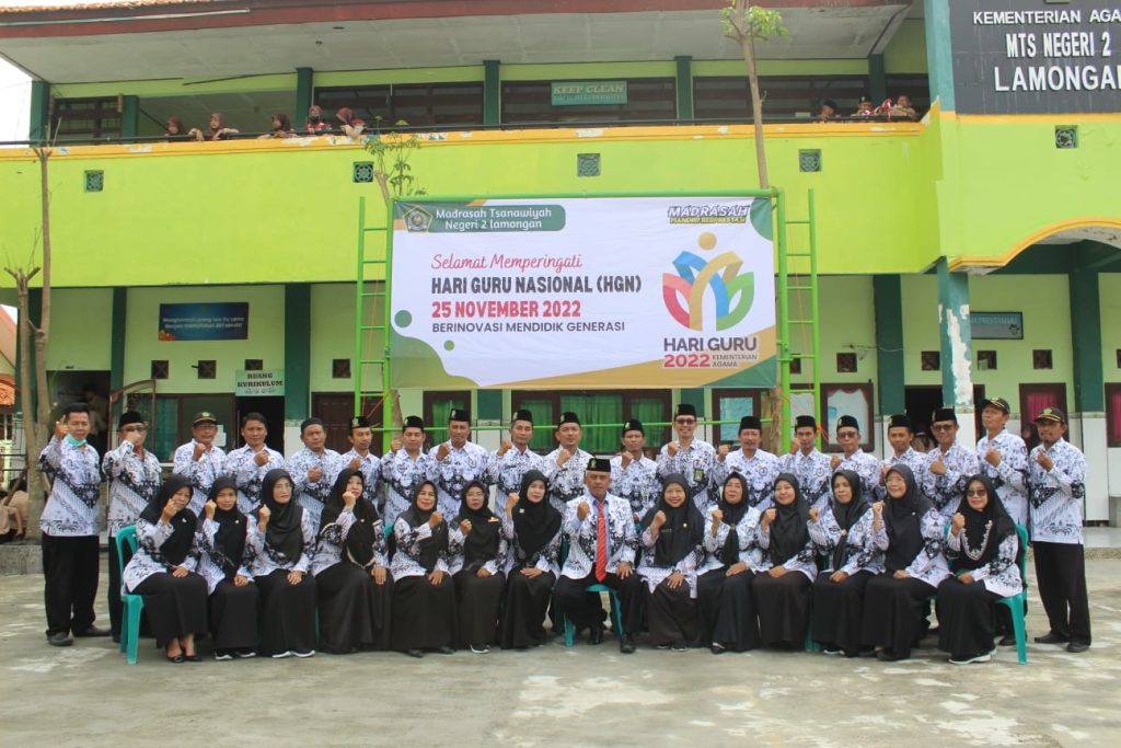 Lamongan, 25 November 2022 MTsN 2 Lamongan mengadakan Upacara Hari Guru Nasional. Hari Guru Nasional Kementerian Agama pada Tahun ini mengangkat tema “Inovasi Mendidik Generasi” karena dedikasi seorang guru tiada batas. Para Guru MTsN 2 Lamongan menggunakan seragam PGRI dan anak anak berbaju Pramuka dalam mengikuti upacara ini. Petugas Upacara adalah Pengurus OSIS MTsN 2 Lamongan dan Pembina upacara adalah Bapak Kepala Madrasah Asman S.Ag.,M.Pd.